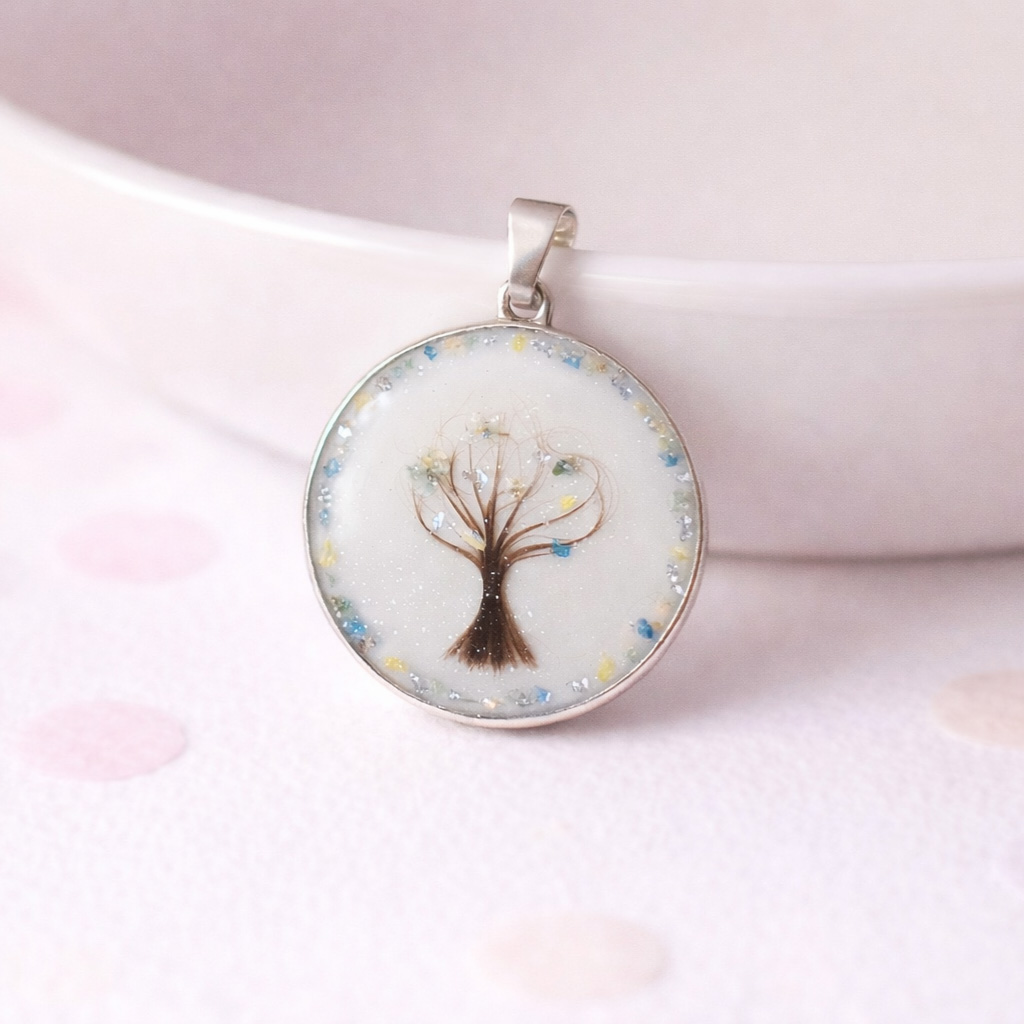 Ich lege dir gerne kleine Bilder wie Herzen oder Bäume aus Haarsträhnen oder Nabelschnurfragmenten. Der große Zauber ist in 18mm Durchmesser und ca. 2,2mm Tiefe erhältlich. Aus Haar und/oder Nabelschnur geformte bildhafte Designs kommen in diesem Anhänger besonders gut zur Geltung. Aber auch schlichte Designs aus Haarsträhnen machen sich hier sehr gut. Beispielsweise eine Strähne schön geschwungen oder aufgefächert am Rand entlang. Hier kannst du kreativ sein und mir deine Wünsche gerne in der Bestellnotiz beschreiben oder auch eine Skizze anfügen. Sollte etwas nicht umsetzbar sein, hörst du von mir.