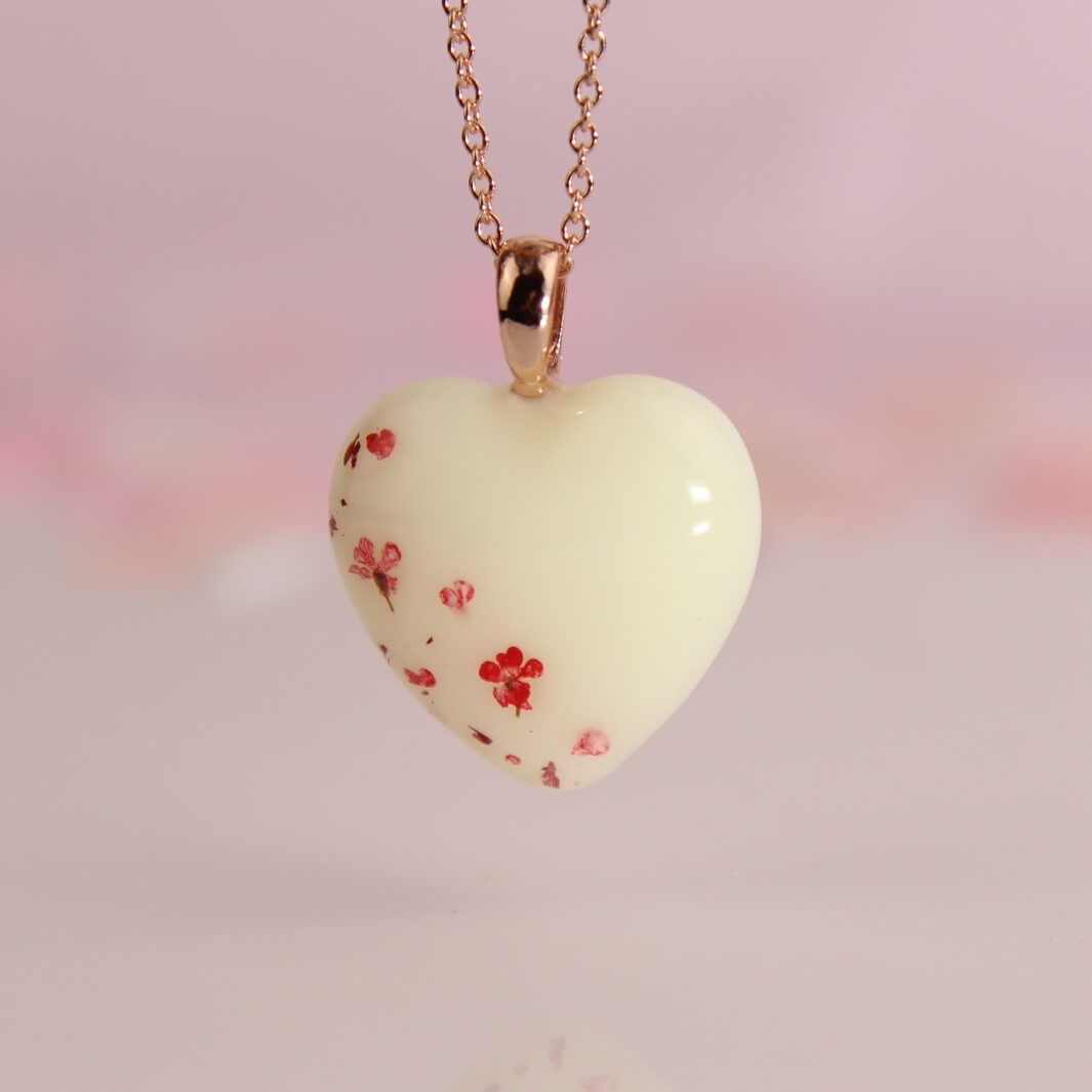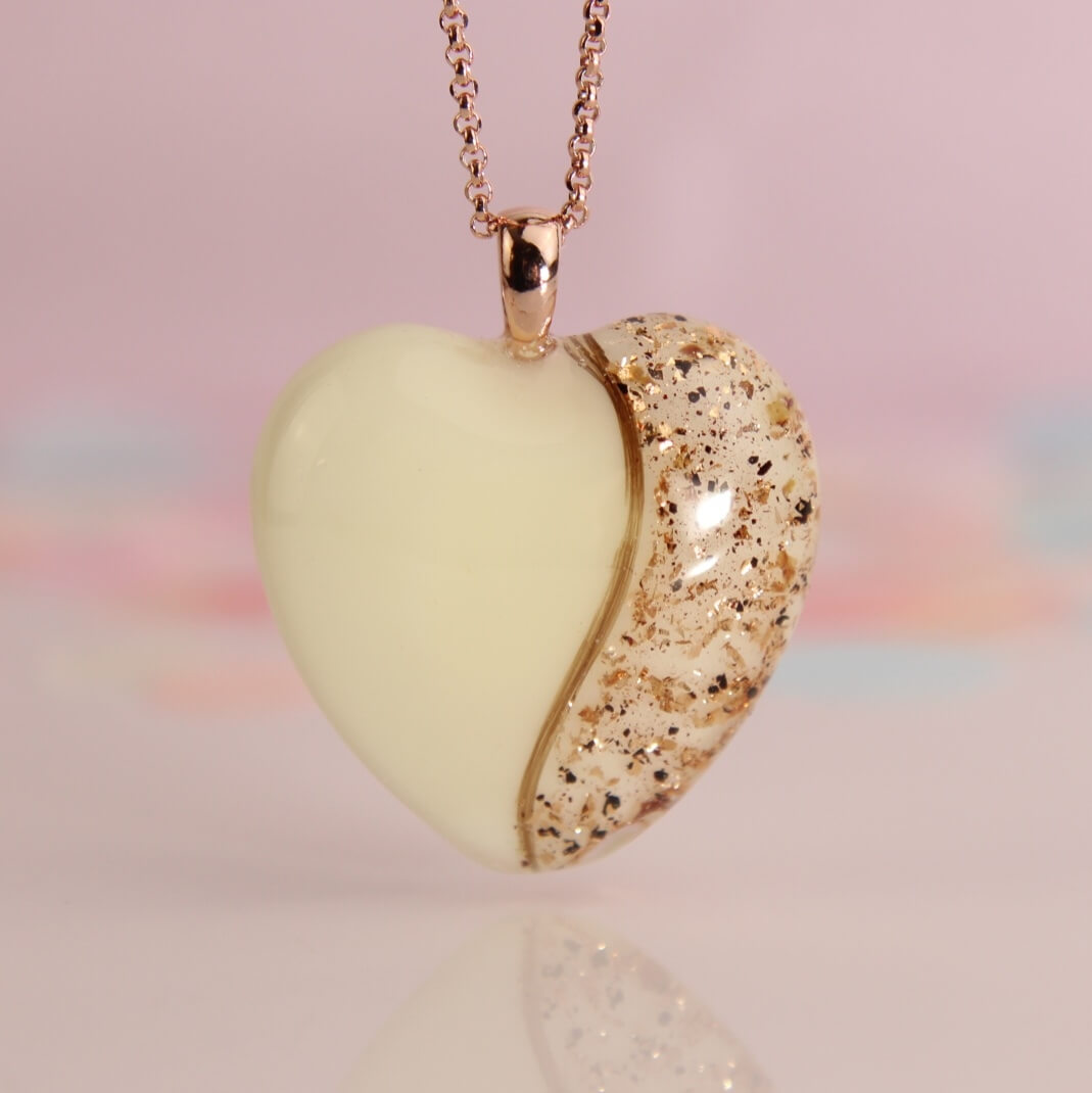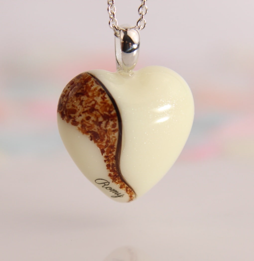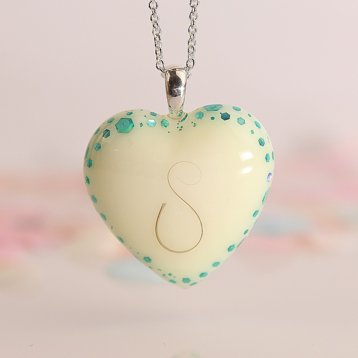 Die Vorderseite des Anhängers Liebeslied ist leicht gewölbt. Die Rückseite ist flach sodass sie gut am Körper anliegt. Hinten wird außerdem die Kettenschlaufe aufgeklebt, sowie mit einer Schicht Resin zusätzlich befestigt. Sie besteht aus einem Teil, ist also unbeweglich und kann sich so auch nicht verdrehen. Die Aufhängung besteht aus 925er Silber und ist je nach Auswahl entweder silbern, vergoldet oder rosèvergoldet.