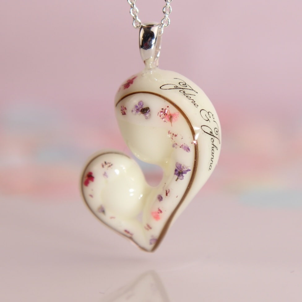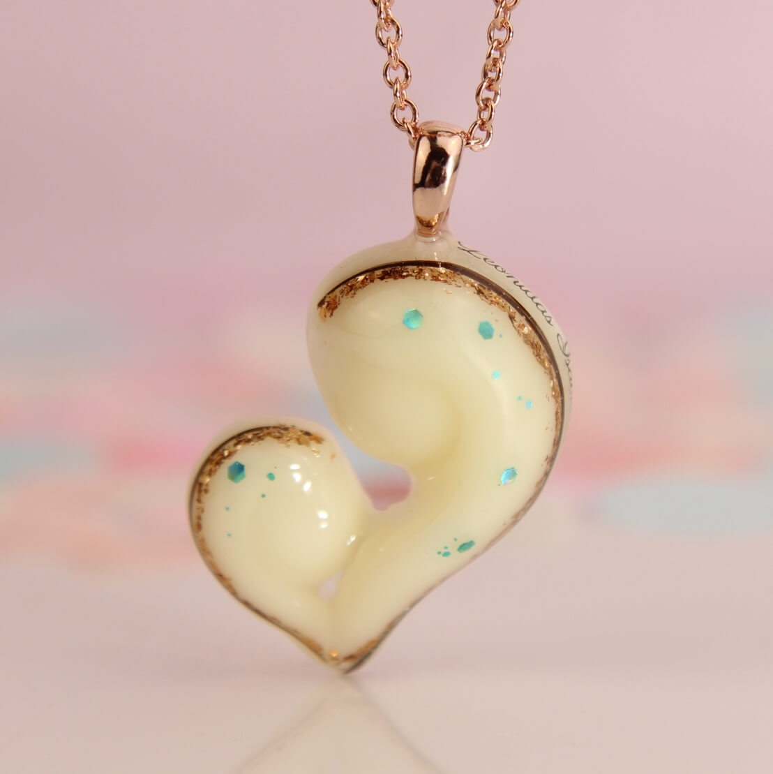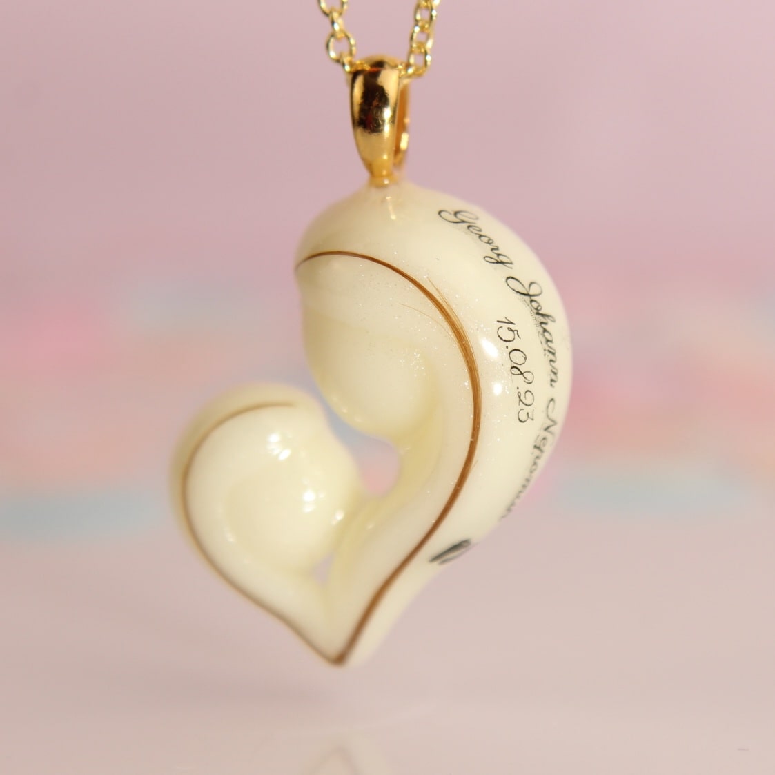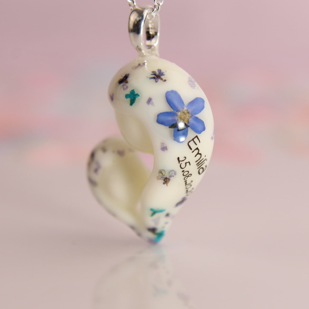 Die Kette ist 45cm lang. Sie ist aus dem gleichen Material das du für die Öse wählst. Der Anhänger selbst ist komplett aus Harz gegossen. Wenn gewünscht, kann auf der Rückseite eine kleine Widmung stehen. Das kannst du unter der Option Inschrift auswählen. Natürlich ist auch dieser Anhänger komplett von einer Schutzschicht umgeben um die Muttermilch und Haare vor Umwelteinflüssen zu schützen.