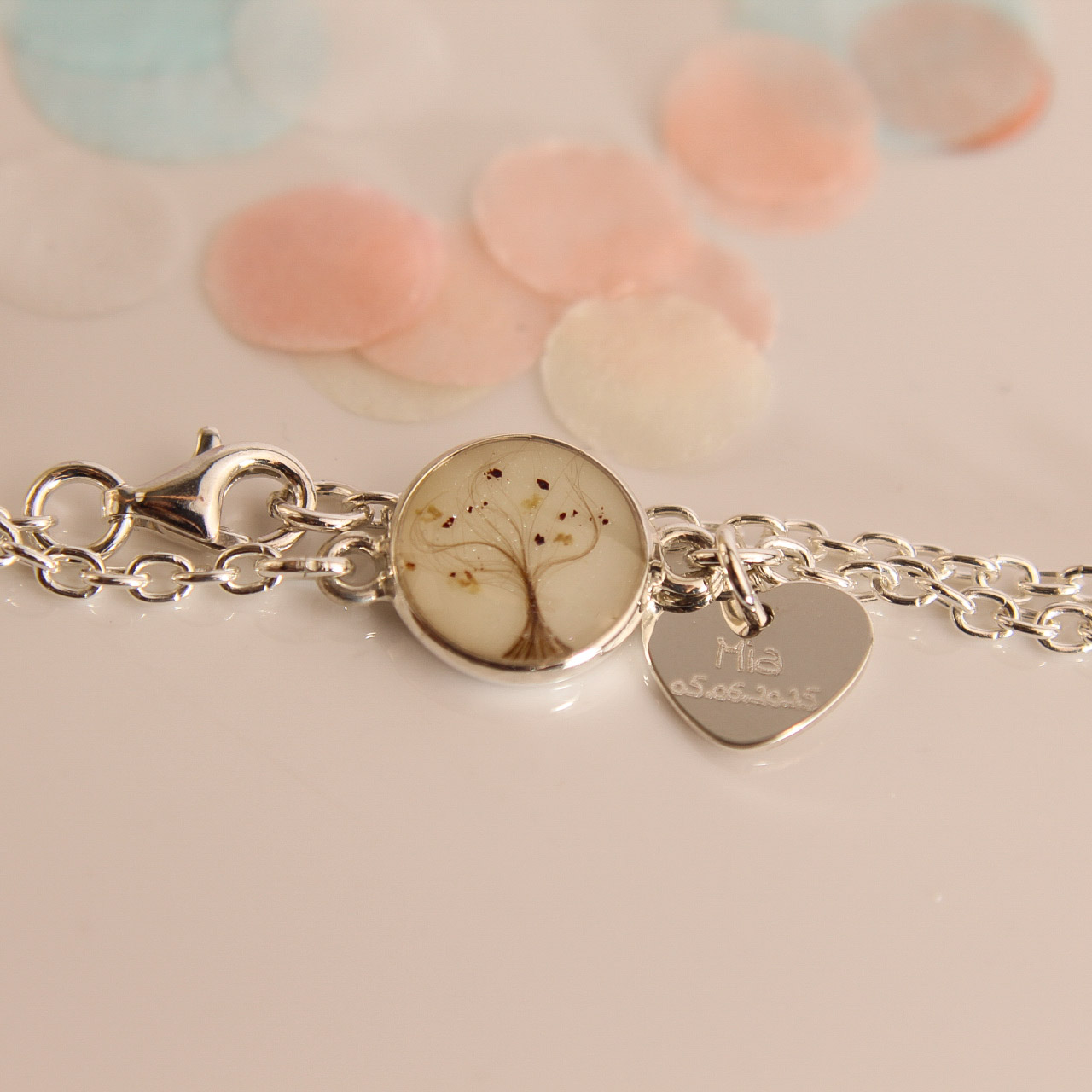 Die runde Fassung, die in der Mitte der Träumerei befestigt ist, hat einen Durchmesser von 10mm. Diese fülle ich gerne mit deiner Muttermilch oder anderen persönlichen Erinnerungen. Ich gestalte für dich Designs aus Haar oder Nabelschnur nach deinem Wunsch. Bitte beachte hierbei die kleine Größe der Gestaltungsfläche des Armbandes Träumerei.