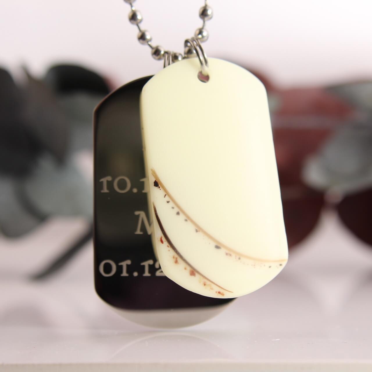 Die zweite Platte besteht aus silberfarbenem Edelstahl. Sie ist für deine individuellen Gravuren gedacht. Sie ist ca. 4cm hoch und 2,5cm breit. (Achtung neue Größe) Die Harzplatte ist insgesamt ein paar mm kleiner.