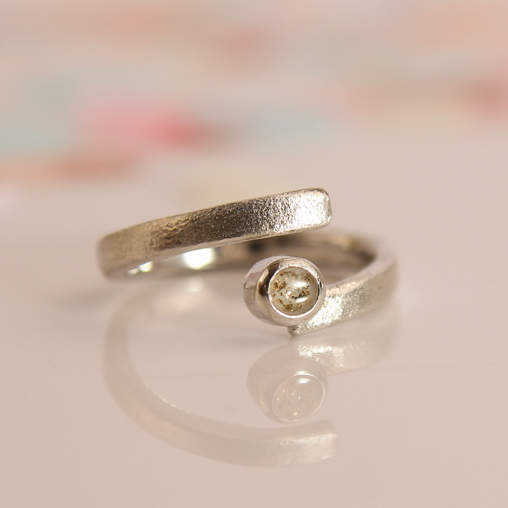 Der offene, gewickelte Ring Wirbelwind wird von mir per Hand hergestellt. Ich fülle den Ring gerne für dich mit Muttermilch, Asche oder Nabelschnur. Auch für ein kleines Haarsträhnchen ist Platz. Die Eismattierung auf der Außenseite des Rings, verleiht ihm eine interessante und glitzernde Optik. Dir gefällt die Mattierung nicht? Kontaktiere mich vor deiner Bestellung gerne und wir besprechen die Gestaltung deines Rings.